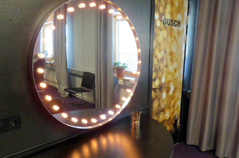 Det här är Folkets Hus stora artistloge. Här lägger våra gästande stjärnor sista handen på sminket innan de äntrar scenen, de sjunger upp och går igenom manuset en sista gång före en föreställning. Här finns egen wc och dusch på rummet, TV och två sminkbord.